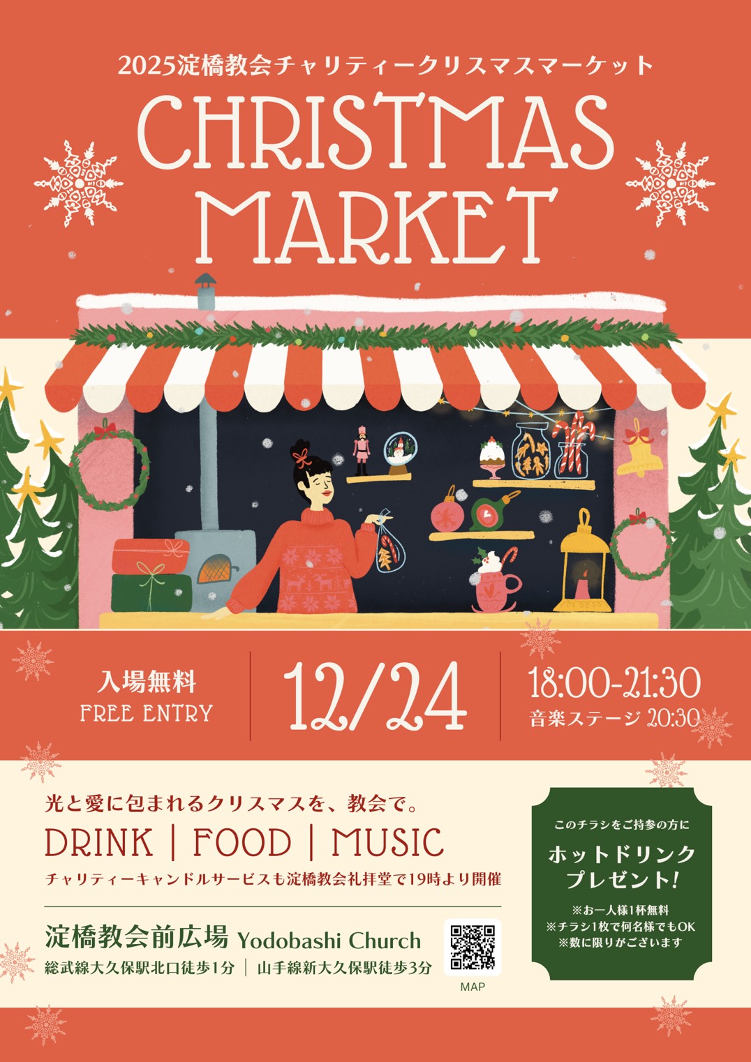 12/24 CHRISTMAS MARKET (淀橋教会チャリティークリスマスマーケット) 2025年11月22日 最終更新日時 : 2025年11月24日 YoshikawaYotaro 日時:2025年12月24日 18:00-21:30 (音楽ステージ20:30)場所:淀橋教会前広場 光と愛に包まれるクリスマスを、教会で。DRINK | FOOD | MUSIC※チャリティーキャンドルサービスも淀橋教会礼拝堂で18:45より開催